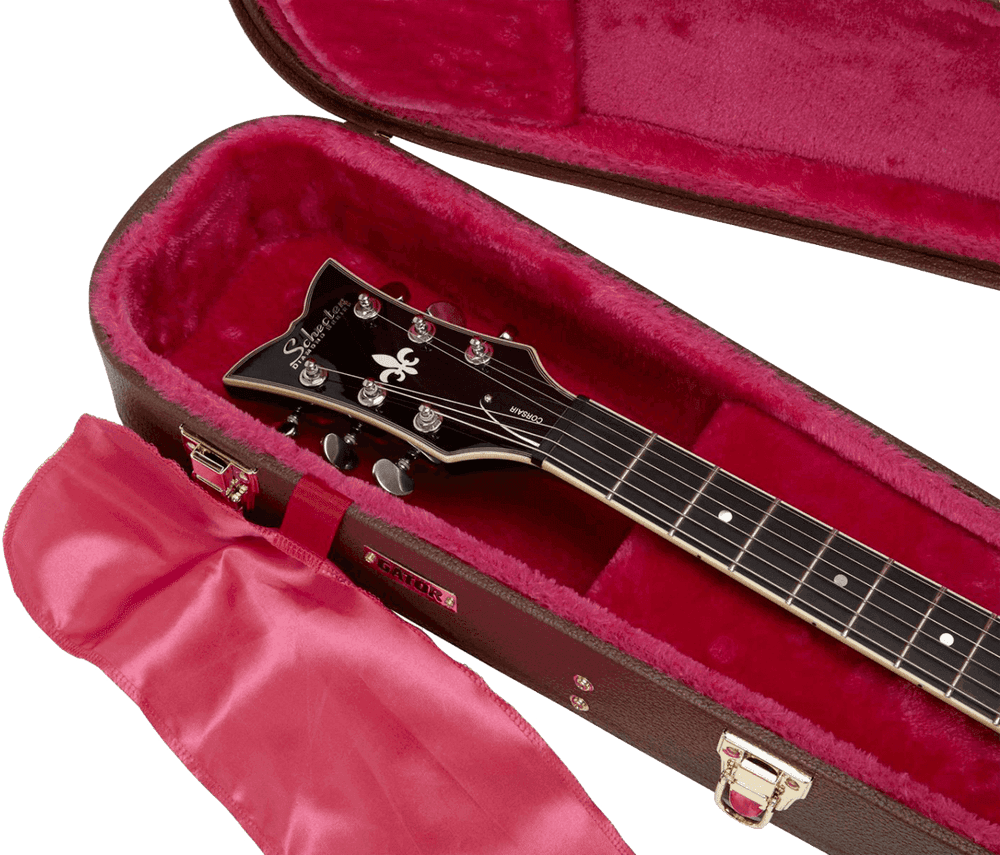El interior del estuche está meticulosamente forrado con un acolchado de espuma y cubierto por una lujosa felpa de color magenta que acuna la guitarra, previniendo cualquier movimiento indeseado durante el viaje. Este revestimiento suave protege el acabado del instrumento, manteniéndolo en perfectas condiciones. Además, cuenta con un compartimento de almacenamiento interno, ideal para guardar accesorios esenciales como afinadores, cuerdas, púas y cejillas. El asa de transporte ergonómica y acolchada proporciona un agarre cómodo y seguro, facilitando su transporte a ensayos, conciertos o estudios de grabación.
