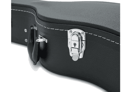 La carcasa está construida en contrachapado resistente con revestimiento exterior de tolex negro de alto gramaje y costuras en contraste, lo que proporciona una barrera dura frente a impactos y roces típicos de escenarios, furgonetas y aulas. El estuche incorpora herrajes triple cromados y cierres bloqueables, de modo que puedes asegurar tu guitarra cuando la dejas en camerinos, almacenes o zonas compartidas. El conjunto se completa con una asa acolchada ergonómica que reparte el peso y hace más cómodo el transporte incluso con la guitarra dentro.