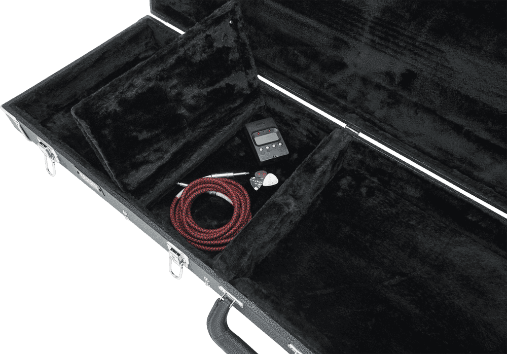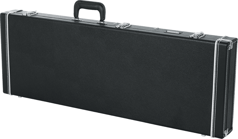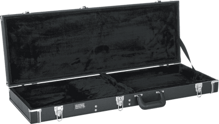 Estuche rígido para guitarra eléctrica con construcción en madera contrachapada y revestimiento exterior de Tolex negro. Interior acolchado con espuma y forrado en vellón de felpa, con compartimento para accesorios. Dispone de tres herrajes cromados, uno de ellos con cerradura. Incorpora un asa de transporte ergonómica y acolchada. Dimensiones exteriores: 1098,6 x 406,4 x 120,6 mm. Dimensiones interiores: 1060,4 mm de longitud total, 317,5 mm de anchura y 82,6 mm de altura. Peso total de 4,90 kg.