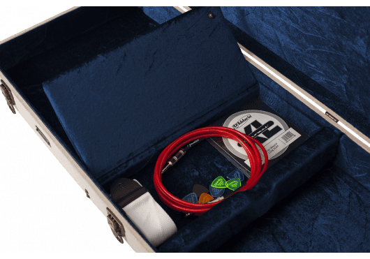 - Espacioso compartimento interior con tapa para accesorios (cables, correa, cuerdas, afinador, etc.).