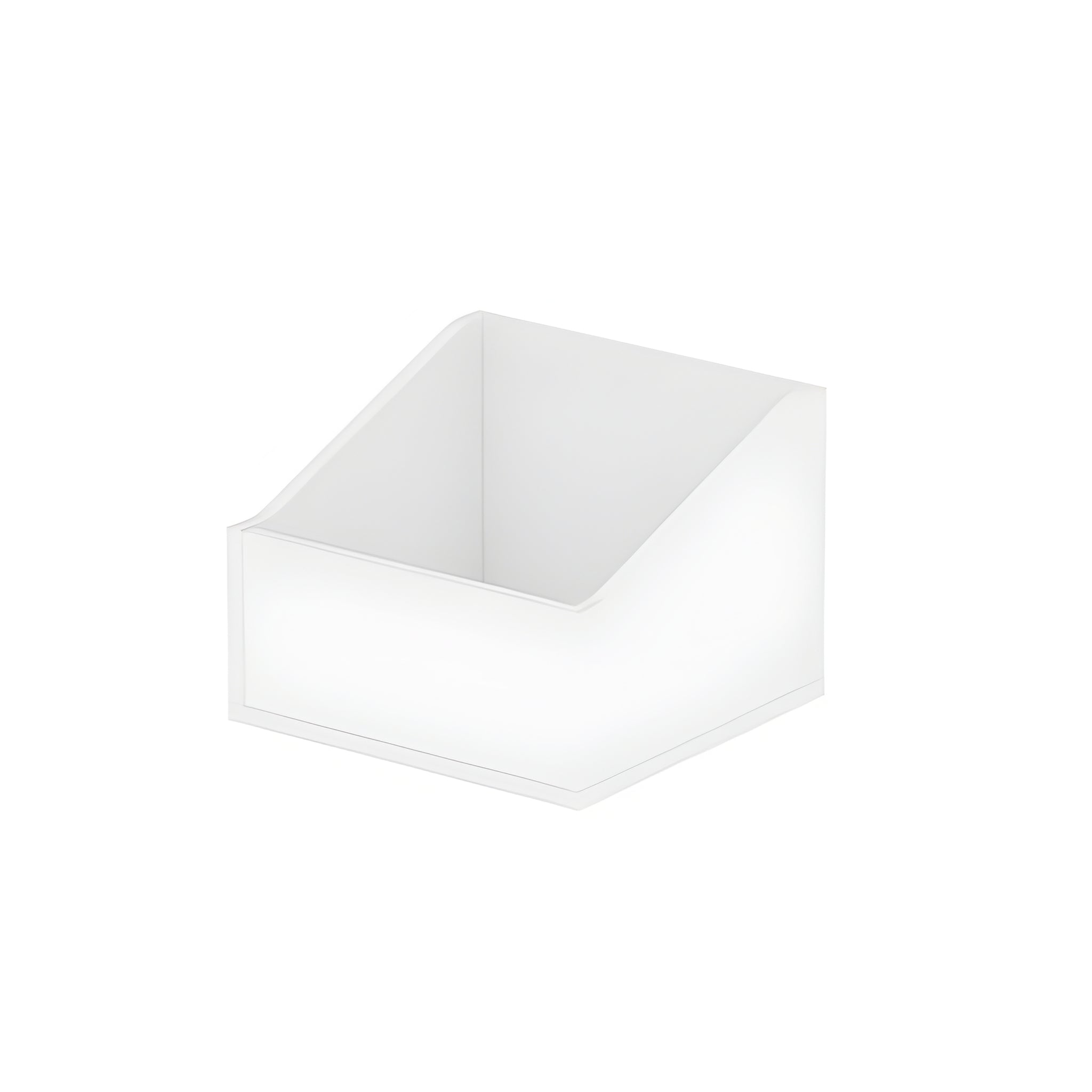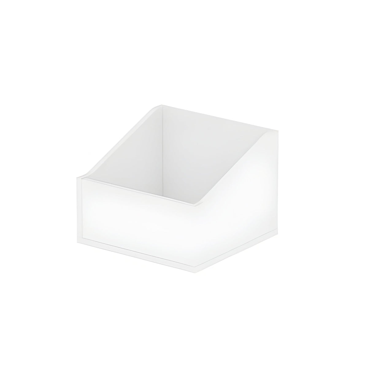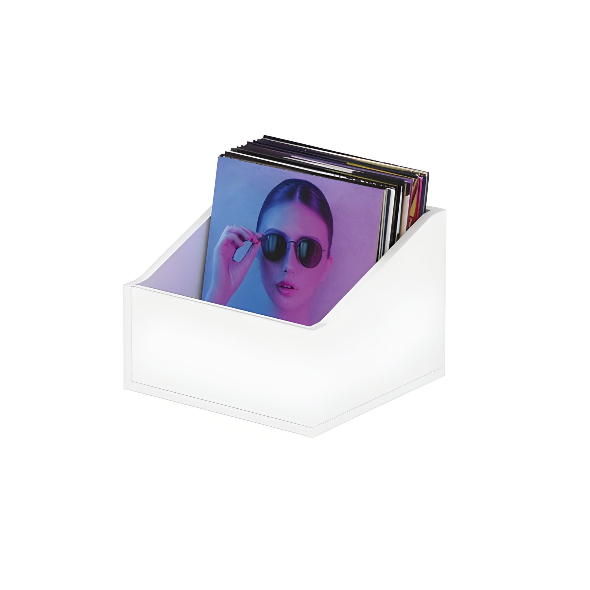 Caja para almacenamiento de vinilos de 12" con laterales inclinados; material MDF; capacidad aprox. 110 LP; color blanco; dimensiones (An × Al × F): 355 × 265 × 340 mm; dimensiones interiores (An × Al × F): 325 × 325 × 327 mm; peso 4,4 kg; acabados disponibles: blanco, negro o madera sin tratar.