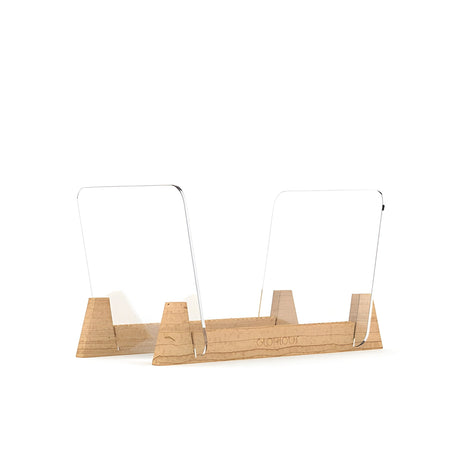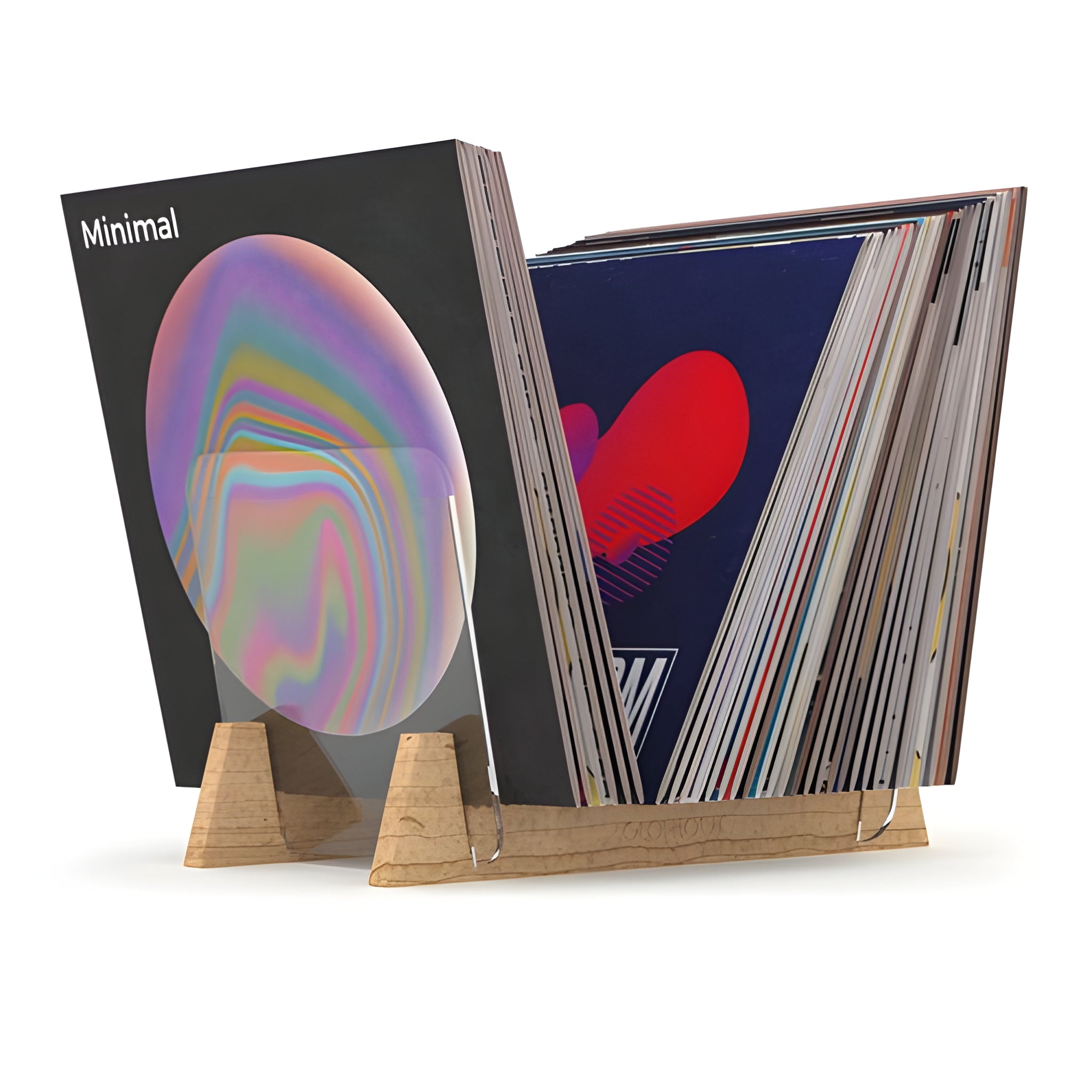 Expositor de sobremesa para vinilos con capacidad hasta 75 discos; madera estriada + paneles de acrílico; apto para 7", 10" y 12"; inclinación bilateral para evitar caídas; dimensiones 360 × 200 × 145 mm (An × Al × F); peso 0,64 kg; color madera natural con acrílico transparente.