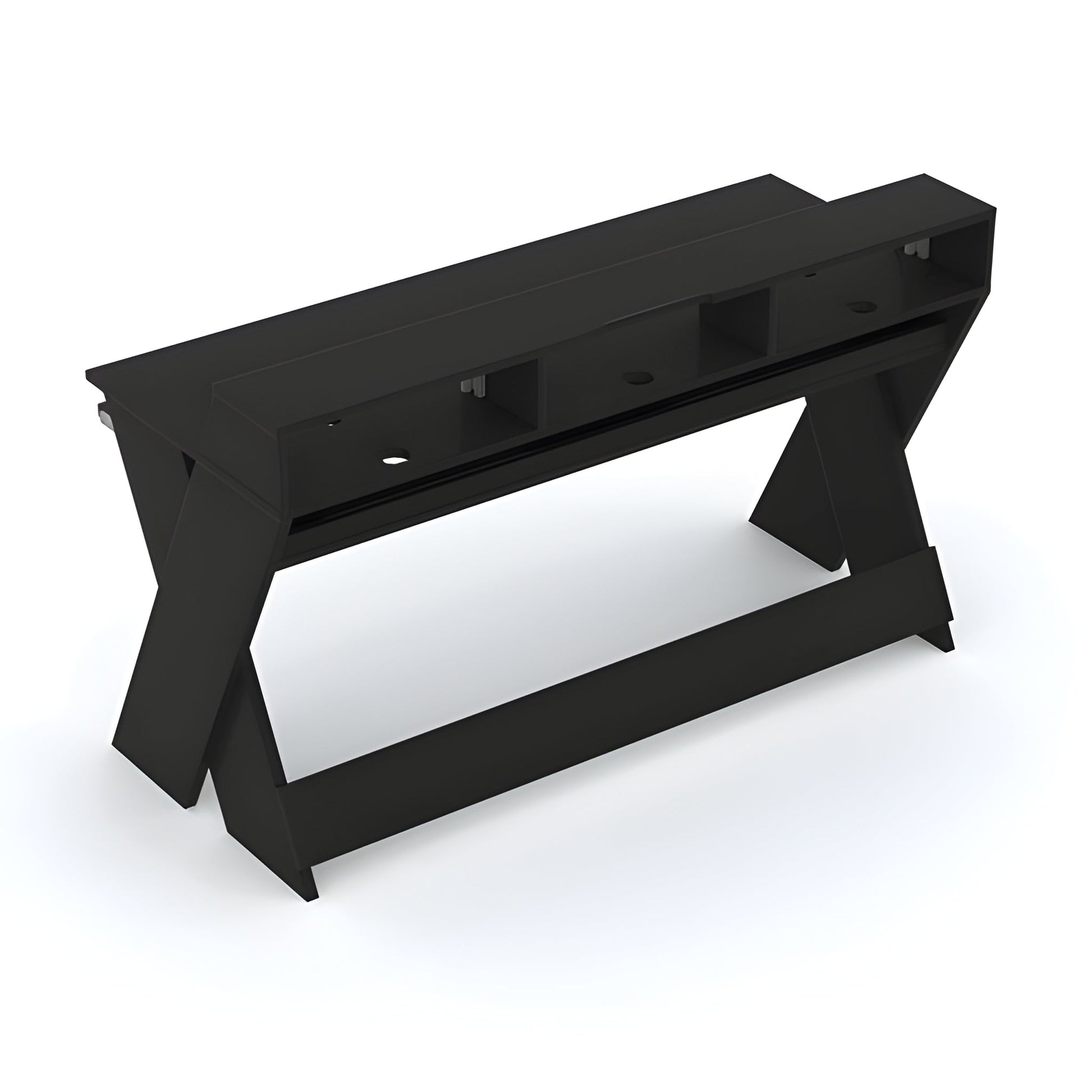 El chasis, con diseño en forma de X, aporta gran estabilidad y rigidez. La mesa integra una gestión de cableado muy cuidada con pasacables en la parte superior, interior y base, además de un canal interior accesible por delante y por detrás para organizar regletas y fuentes. Un receso trasero a la altura de la pantalla facilita instalarla a ras de pared. El acabado negro y la construcción en MDF/engineered wood con refuerzos metálicos redondean un mueble robusto y listo para uso intensivo.