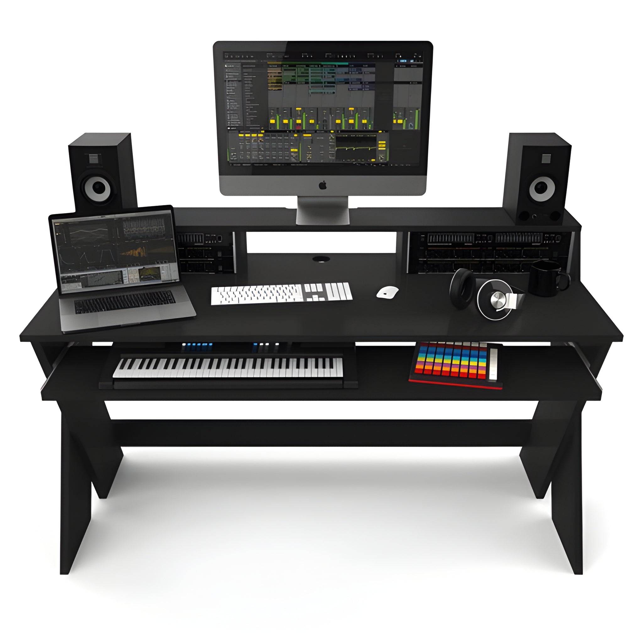 La Glorious Sound Desk Pro Black es una mesa de estudio profesional diseñada para convertirse en el centro de tu producción, tanto en casa como en el estudio. Permite producir en 3 niveles simultáneamente: superficie principal de gran anchura y profundidad para ordenador y controladores, dos ranuras de rack de 19” (3U + 3U) para outboard y una bandeja extraíble capaz de alojar teclados de hasta 88 teclas con 4 posiciones de altura. Un compartimento central mantiene a mano la interfaz de audio o el portátil sin invadir la encimera.