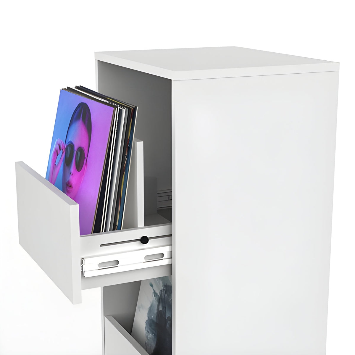 El Glorious Vinyl Vault White es un mueble de almacenaje para vinilos con dos cajones de acceso frontal que permite hojear (“flip”) tu colección con total comodidad y sin renunciar a la protección. Cada cajón ofrece espacio para hasta 80 LP de 12" y está montado sobre guías telescópicas de extracción total con cierre suave, lo que facilita alcanzar los discos del fondo y minimiza golpes y ruidos. Un panel trasero regulable de forma continua mantiene los discos firmes independientemente del grosor de las fundas. El cuerpo, en color blanco, está construido en tablero de partículas y MDF para una alta estabilidad.