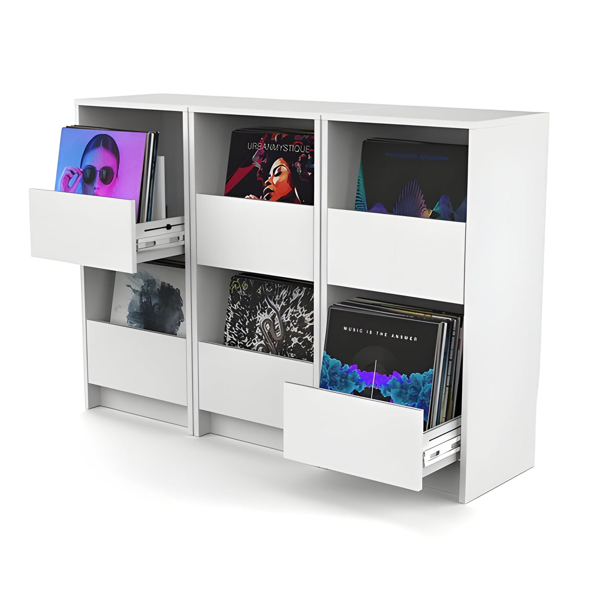 - Acceso rápido y ordenado: el sistema de cajones de extracción total y cierre suave facilita el “crate digging” sin fricciones.