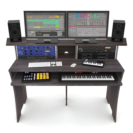 Reloop Glorious Workbench Driftwood - Estación de trabajo de estudio en nogal con bandeja para teclado y soportes de monitores giratorios