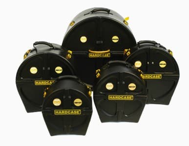 Pack de estuches rígidos Hardcase para batería: HN10T (tom 10"; profundidad 8"–10"), HN12T (tom 12"; 8"–13"), HN14FT (floor tom 14"; 14"–15"), HN14S (caja 14"; 5"–7"; Ø interno útil 439 mm/recorte 497 mm) y HN20B (bombo 20" con ruedas 75 mm; Ø interno 606 mm; profundidad 458–584 mm); carcasa de polietileno (MDPE) resistente al agua con foam pads; tapas telescópicas; correas de 30 mm con clips; diseño apilable; asas e ID badge; fabricación en Reino Unido; peso total de referencia del set ≈ 23 kg.