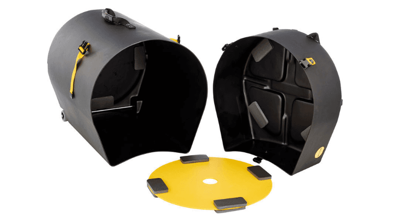 Estuche rígido combo con ruedas para dos cascos 13" y 14". Carcasa impermeable de plástico de alto impacto moldeada en una pieza; divisor acolchado y pads de espuma; correas con clips; tapa telescópica; diseño apilable; ID badge. Diámetros de referencia: A ≈ 497 mm; B ≈ 439 mm. Profundidad interna combinada: ≈ 483–610 mm (≈19"–24"). Peso: ≈ 5,5–5,9 kg (según versión). Color negro.