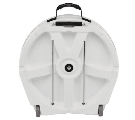 Estuche rígido para platos HNP9CYM22W (blanco). Capacidad: 9 platos hasta 22″. Dimensiones internas aprox.: diámetro 59,5 cm; profundidad máx. 13,0 cm. Peso aprox.: 3,8 kg. Carcasa de polietileno rotomoldeado; tapa con bisagras; ruedas y asa telescópica; apilable. Incluye 8 separadores de espuma. Color: blanco. Fabricado en Reino Unido.