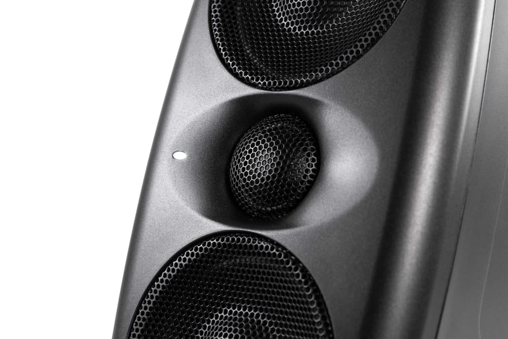 - Biamplificación Clase D 100 W por monitor (70 W LF + 30 W HF) con cruce digital de fase lineal a 2,8 kHz.