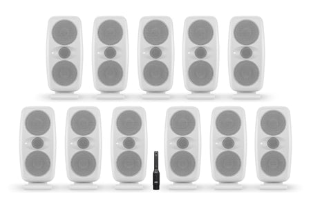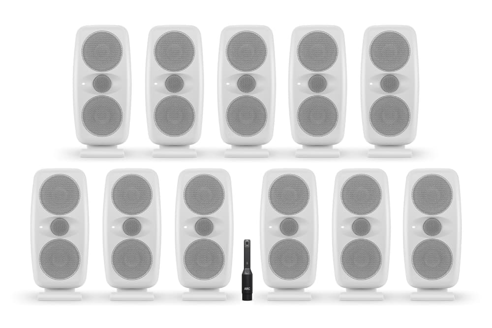Bundle de 11 monitores activos de 2 vías/3 transductores con DSP a 96 kHz. Por monitor: 2 × 3,5" (fibra de celulosa) + 1" (cúpula de seda con cámara trasera); biamplificación Class-D 100 W RMS (70 W LF + 30 W HF); respuesta 48 Hz–28 kHz (±2 dB) y 36 Hz–32 kHz (@ −10 dB); fase ±15° (200 Hz–20 kHz); SPL continuo 97 dB y pico 110,5 dB (free-field) / 112,5 dB (half-space); crossover digital de fase lineal a 2,8 kHz; controles LF Extension (−3 dB a 40/50/60/80 Hz), LF shelf (+2/−3 dB @100 Hz), HF shelf (+2/−3 dB @8 kHz), Desk (−4 dB @160 Hz / +1 dB @1,8 kHz); conectores combo XLR/TRS, entrada ARC 3,5 mm, USB-B; latencia total 2,44 ms; alimentación 90–240 V AC; dimensiones 264 × 160 × 130 mm; peso 2,5 kg por unidad; color blanco. Incluye micrófono ARC y accesorios de calibración.
