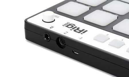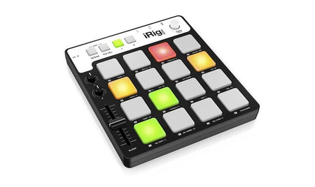Controlador MIDI de pads ultraportátil con 16 pads sensibles a la velocidad y LEDs multicolor; controles asignables: 2 knobs, 1 encoder con pulsación, 1 fader y 2 botones; 16 escenas programables; entrada de pedal de expresión/sustain; bus-powered y class-compliant. Conexión Lightning (iOS) y USB (Mac/PC); incluye iRig Pads Editor. Dimensiones: 190 × 205 × 23 mm; peso: 547 g. Software: SampleTank 4 SE (Mac/PC) y SampleTank iOS.