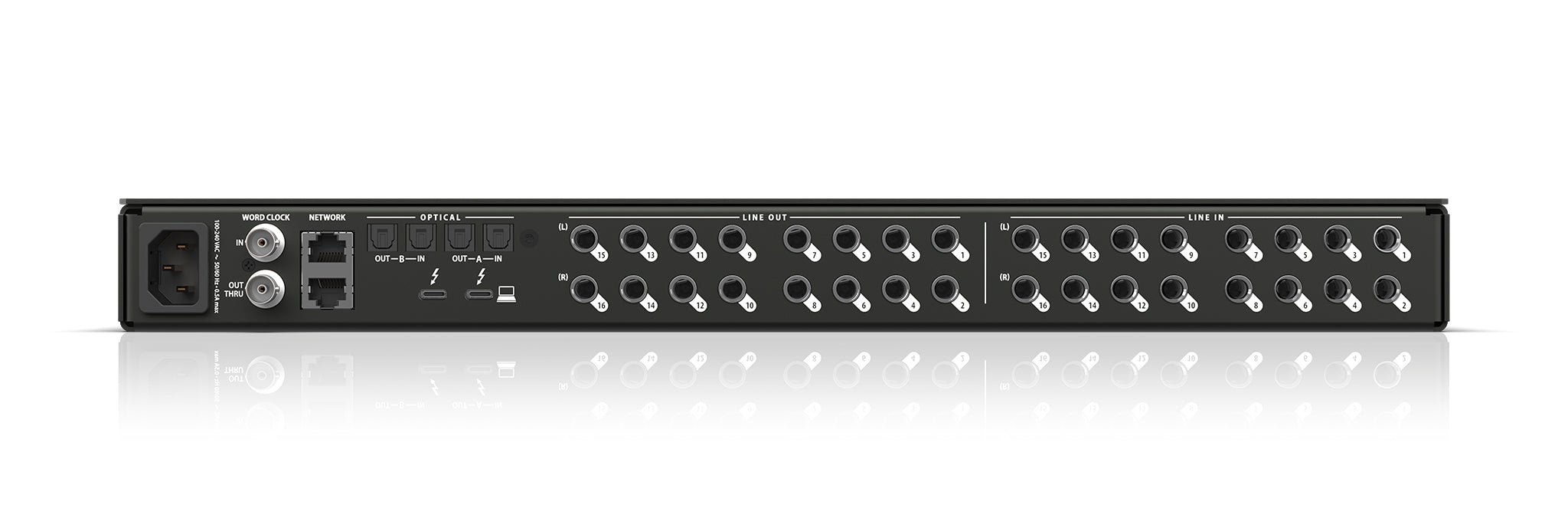 Interfaz de audio en formato rack 1U con conectividad Thunderbolt 4, USB-C y red AVB Ethernet. Ofrece un total de 32 entradas y 34 salidas simultáneas (a 44.1/48 kHz). El panel trasero cuenta con 16 entradas y 16 salidas analógicas de nivel de línea en conectores TRS balanceados de 6.35 mm, además de salidas principales dedicadas XLR. La E/S digital se compone de 2 bancos de ADAT óptico, proporcionando 16 canales de entrada y salida. Soporta frecuencias de muestreo desde 44.1 kHz hasta 192 kHz. El sistema incluye un mezclador digital interno de 64 canales con procesamiento DSP de punto flotante de 32 bits, que incluye ecualización, compresión y efectos de reverb.
