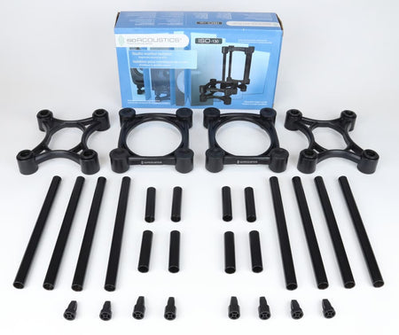Stand acústico ISO 130: base 130×152 mm, ajuste de altura 71–210 mm, inclinación ±6,5 °, ABS y sistema elastomérico, capacidad 9 kg, pack de 2.