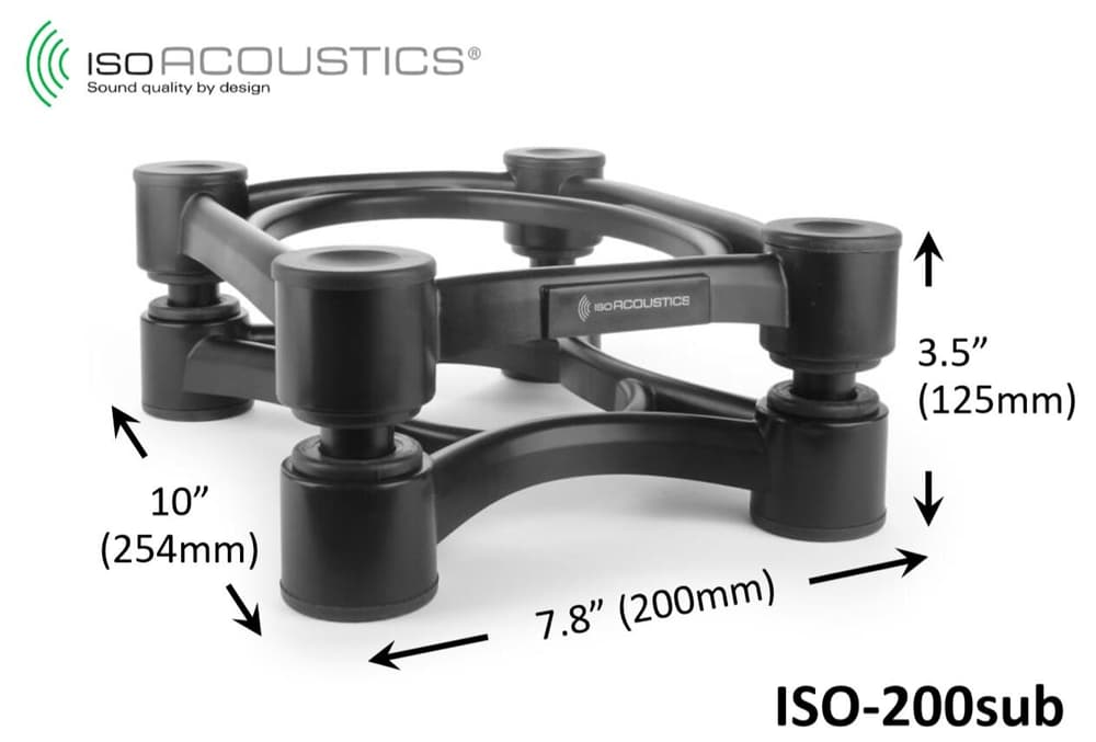 Soporte de aislamiento acústico ISO 200 Sub: dimensiones 200×255×95 mm, capacidad 34 kg, estructura de ABS y acero con aisladores elastoméricos, sin ajustes de inclinación o altura.
