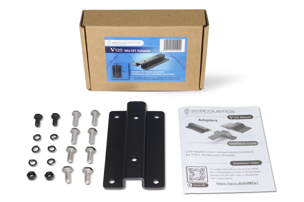 El IsoAcoustics V120 50×107 Adapter es una placa de montaje de acero de alta resistencia diseñada para acoplar altavoces profesionales a los soportes en L (L-Bracket) y en C (C-Bracket) del sistema V120 en instalaciones de techo y pared. Con cuatro orificios de montaje ubicados a 2" de ancho x 4¼" de alto (50,8 × 107,9 mm), permite una sujeción firme y libre de vibraciones, maximizando la claridad y transparencia del sonido. Incluye tornillos M6 y ¼″-20, y su diseño robusto garantiza durabilidad en entornos de estudio, broadcast y directo.
