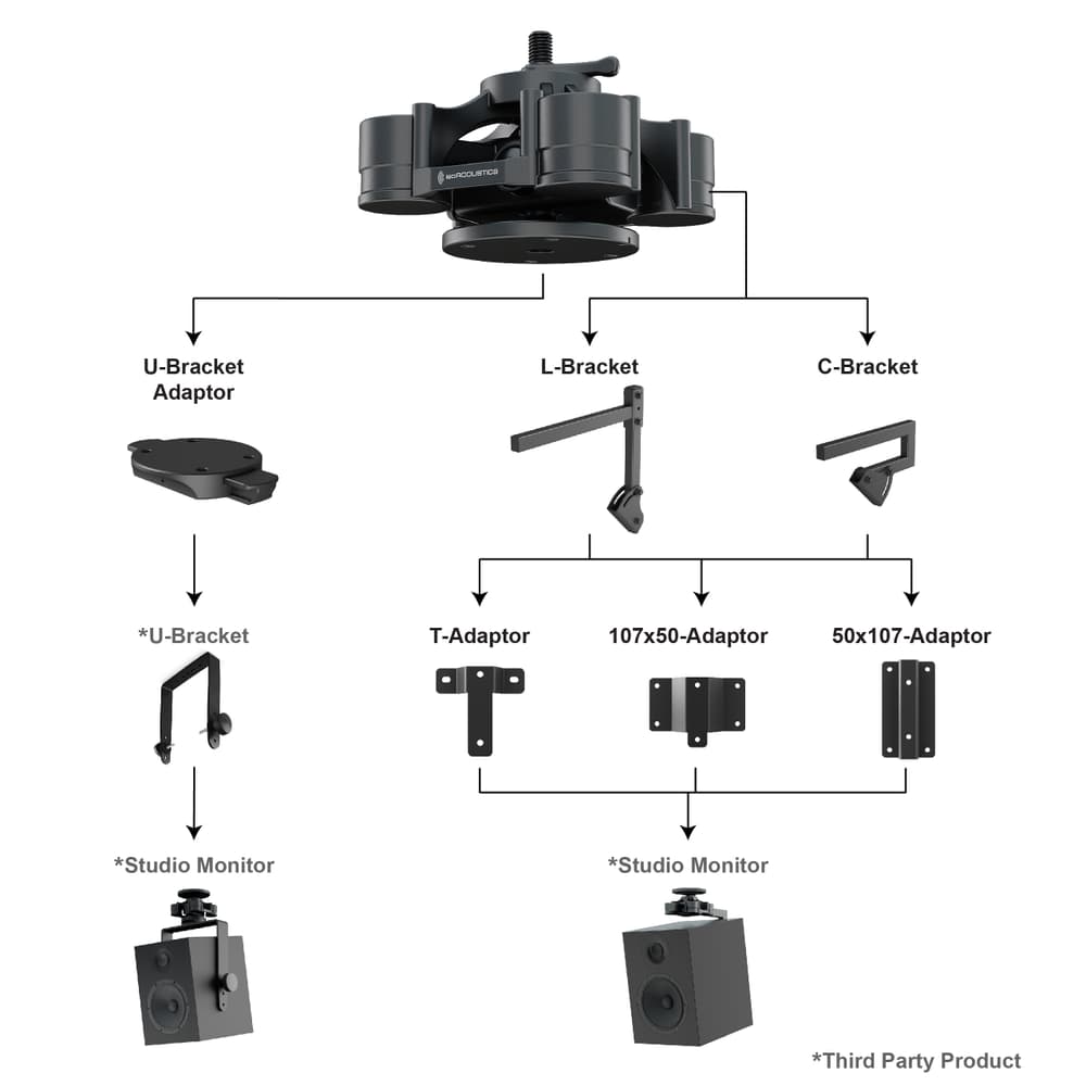 - Base inferior con brida para adaptadores IsoAcoustics V120 (U Bracket, T Adapter, L-Bracket, C-Bracket)