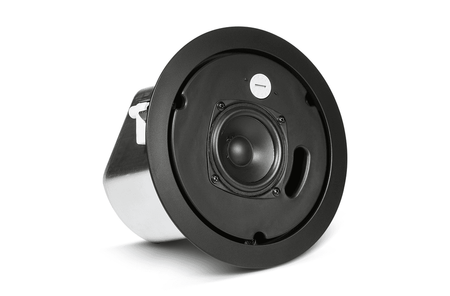 Pack de dos altavoces de techo de rango completo con transductor de 76 mm (3 pulgadas). Incorpora backcan de acero de montaje ciego. Operación dual en baja impedancia (8 ohmios, 20W de potencia continua) y línea de 70V/100V con transformador integrado y tomas de 15W, 7.5W, 3.8W (y 1.9W solo a 70V). Respuesta en frecuencia (-10 dB) de 68 Hz a 17 kHz y sensibilidad de 84 dB SPL (1W/1m). Ofrece una cobertura cónica de 130°. Deflector de material UL94-V0 y rejilla de acero pintable en color blanco. Diámetro exterior de 196 mm y profundidad de 138 mm.