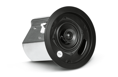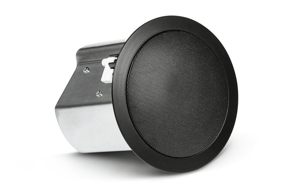 El JBL Professional Control 14C/T-BK es un altavoz de techo de dos vías, compacto y fiable, pensado para instalaciones comerciales que exigen alta inteligibilidad y una cobertura amplia y uniforme. Su arquitectura coaxial combina un woofer de 100 mm con cono de polipropileno y borde de caucho de butilo con un tweeter de cúpula blanda de 19 mm refrigerado por líquido, montados en un bafle ventilado y pintable fabricado en ABS resistente a los rayos UV (clasificaciones UL94-V0 y UL94-5VB). La lata trasera metálica de montaje ciego (backcan) viene preinstalada, lo que agiliza una instalación limpia desde la cara del techo y garantiza un rendimiento estable en espacios de manejo de aire.
