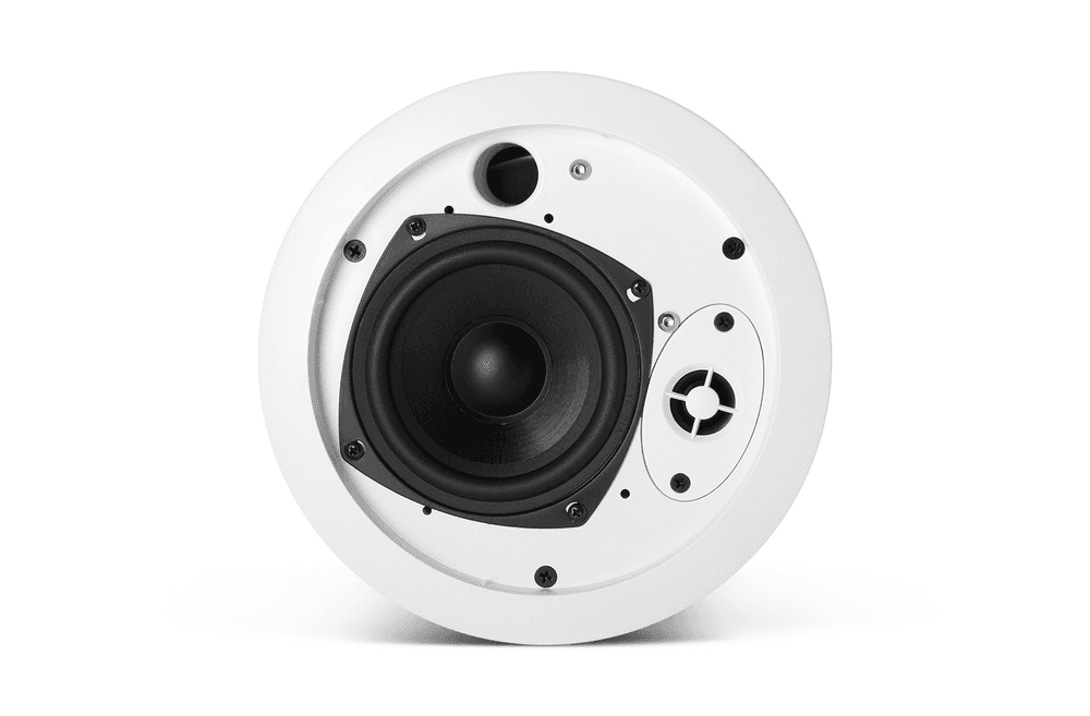 Pareja de altavoces compactos para instalación en techo con un woofer de 4.5 pulgadas (115 mm) de cono de grafito y un tweeter de 0.5 pulgadas (12 mm) de policarbonato. Ofrece una respuesta en frecuencia de 80 Hz a 25 kHz y un ángulo de cobertura de 150°. Funciona a 8 ohmios con una capacidad de potencia de 15 W continuos (programa de 30 W, pico de 60 W). Presenta una sensibilidad de 86 dB SPL (1W/1m). Requiere una profundidad de montaje de 100 mm y un diámetro de corte de 127 mm. Incluye rejilla, recipiente trasero (back-can) y rieles para su instalación.