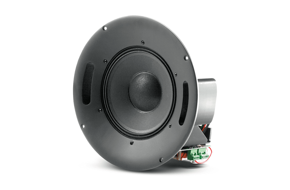- Arquitectura modular: bafle metálico redondo de Ø 305 mm; profundidad instalada 218 mm (modelo CT); peso 5,4 kg.