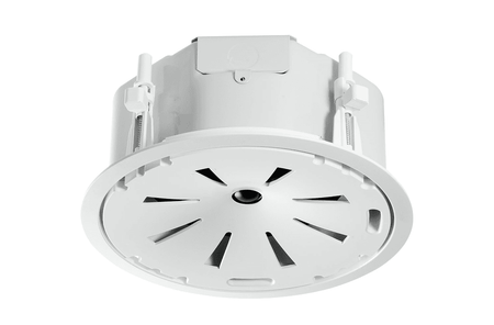 Altavoz de techo de 2 vías y perfil bajo con backcan integrado; cobertura cónica 120°; transductores: LF 165 mm (cono de polipropileno, borde de butilo), HF cúpula blanda 25 mm sobre guía de ondas de 250 mm; operación 8 Ω / 70–100 V con tomas 60/30/15 W (y 7,5 W a 70 V); rango (−10 dB) 68 Hz–20 kHz; respuesta (±3 dB) 100 Hz–17 kHz; sensibilidad 91 dB; SPL máx. 110 dB (116 dB pico) a 1 m en baja Z / 109 dB en toma alta 70/100 V; conectores: 2× bloques de 2 pines con tornillo (hasta 2,5 mm²); corte Ø 282 mm; dimensiones Ø 305 × 142 mm; peso 4,3 kg unidad; apto para plénum (UL1480, UL2043, NFPA 90/70); baffle ABS UL94-V0 y backcan de acero; incluye rejilla, C-ring, tile rails, plantilla y protector de pintura.