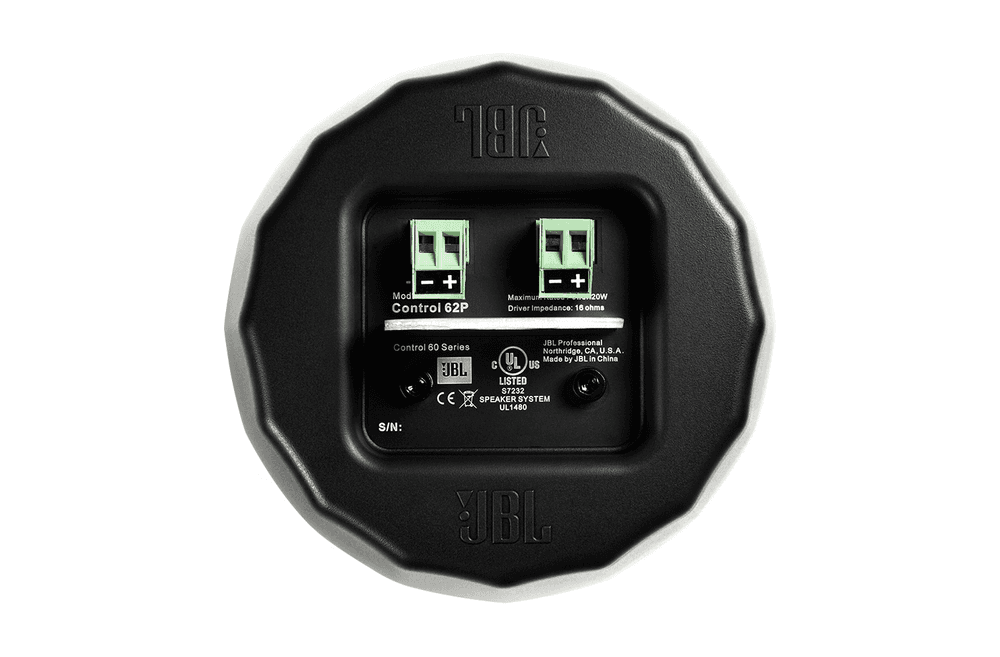 Altavoz colgante satélite JBL Control 62P (negro), 16 Ω, cobertura 140°, respuesta 200 Hz–17 kHz (±3 dB) / 150 Hz–20 kHz (−10 dB), potencia 25/15 W (ruido rosa 2 h/100 h) y 50/30 W programa, sensibilidad 84 dB (2,83 V) / 87 dB (1 W), SPL máx. 97/103 dB, filtro recomendado HPF 150 Hz; transductor 60 mm (2,5″) PP recubierto, suspensión: 2 cables de 4,5 m con Gripple (SWL 45 kg); IP44, listados UL; dimensiones Ø 128 × 121 mm (141 mm hasta soporte); peso 0,7 kg por unidad; pack de 2.