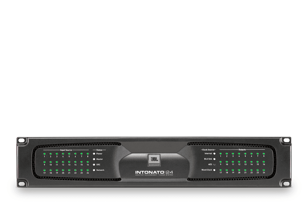 El JBL Intonato 24 es un procesador profesional de 2U que centraliza la gestión, control y calibración de sistemas de monitoraje de hasta 24 altavoces en configuraciones estéreo, surround o inmersivas. Combina 24 entradas analógicas, 24 entradas AES3 y hasta 256 canales de audio en red vía HARMAN BLU link (y Dante/AES67 mediante interfaz BLUDAN opcional), con 24 salidas analógicas y salida simultánea por BLU link hacia amplificadores Crown u otros dispositivos compatibles. El sistema incorpora calibración automática con micrófono incluido, 12 bandas de Room EQ, 8 bandas de User EQ, gestión de subgraves y retardos por altavoz, para entregar una respuesta neutral y consistente en la posición de mezcla.