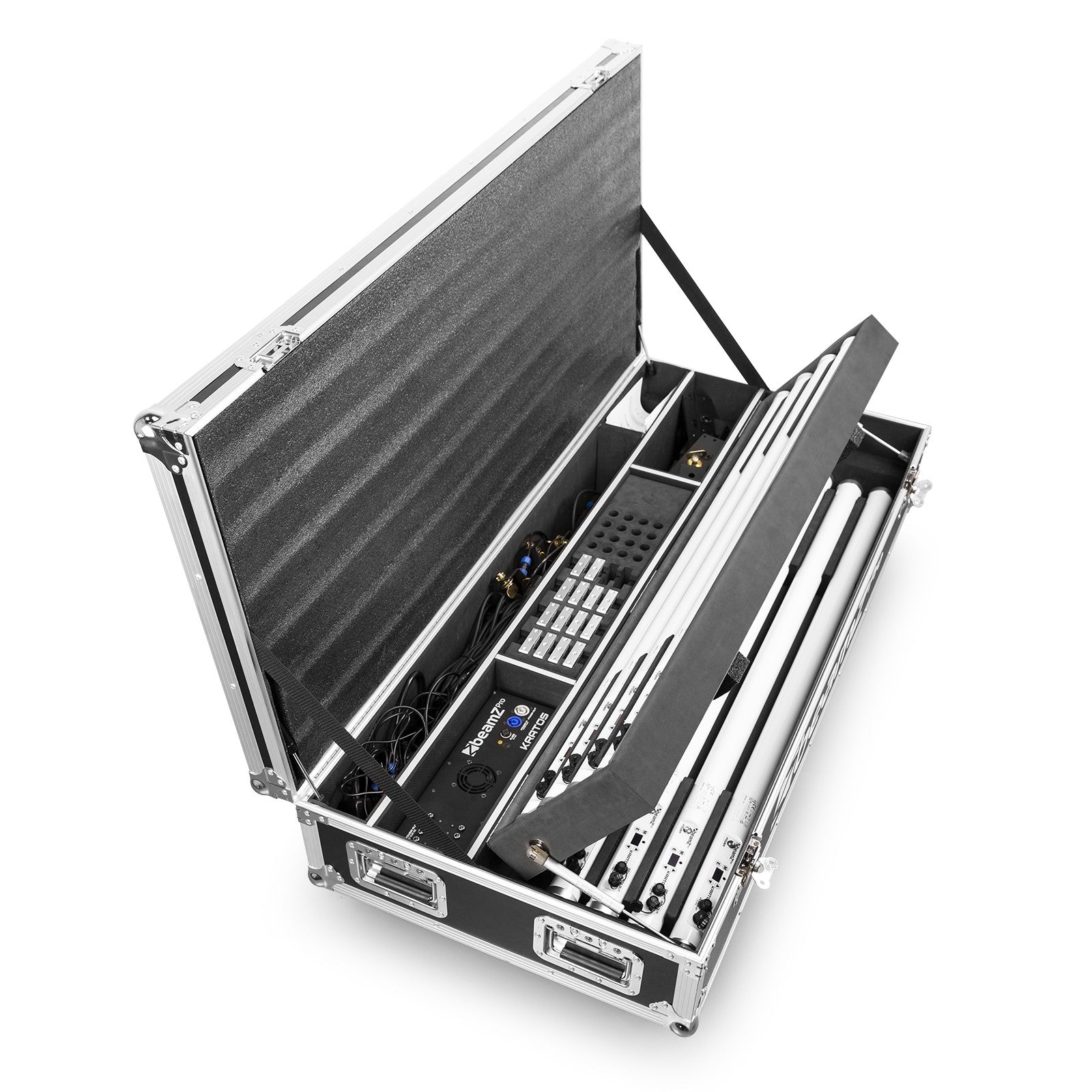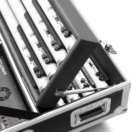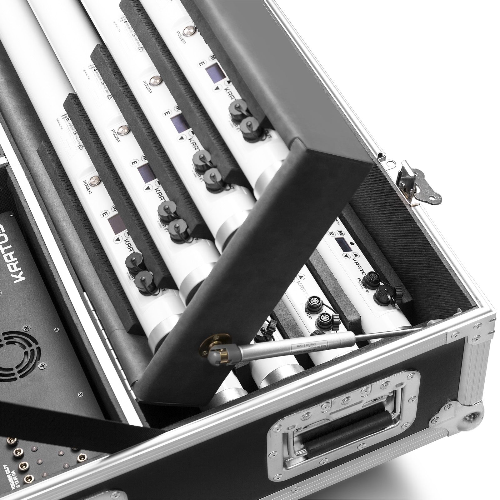 - Kit completo "todo en uno": Incluye 8 tubos LED Kratos y todos los accesorios necesarios, perfectamente organizados en un flightcase profesional con cargador integrado.