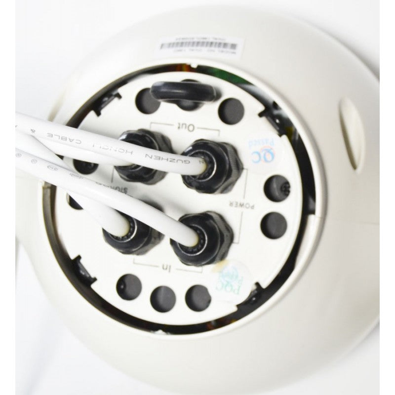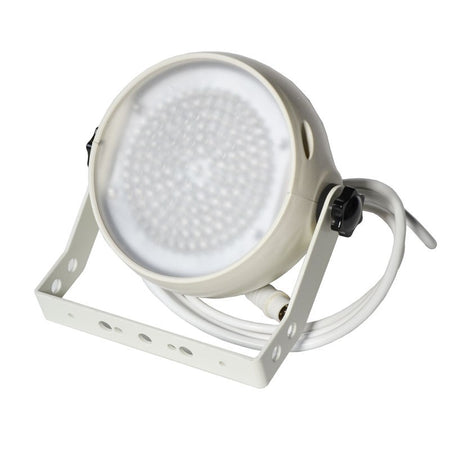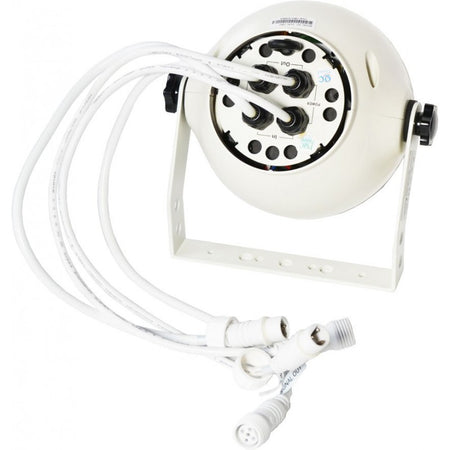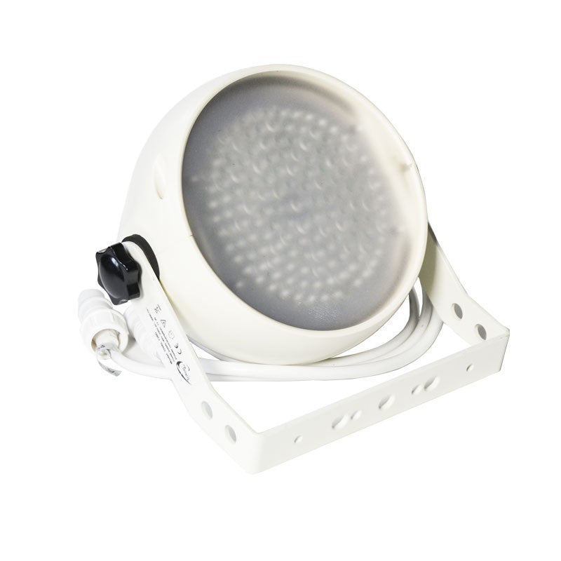 Proyector de superficie con tecnología LED y cuerpo de color blanco. Modelo OVAL 138D. Incorpora 135 diodos LED (45 rojos, 45 verdes, 45 azules) con control de mezcla RGB. Potencia de consumo de 8,4 vatios. Dispone de función estroboscópica de 1 a 18 flashes por segundo. Requiere alimentación y control a través de un controlador externo (230/240V, 50-60Hz). Rango de temperatura de trabajo de -20°C a +45°C. Dimensiones del embalaje: 71 x 45 x 34 mm. Peso de 0,75 kg.