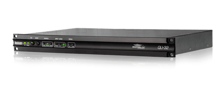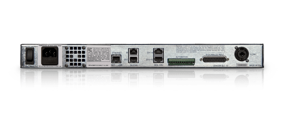 Procesador de inmersión QuantumLogic™ de 32 canales con 8 entradas analógicas, 8 entradas AES/EBU, I/O BLU Link, ecualizador gráfico de 1/3 octava por canal, EQ paramétrico LF, control GPI y Ethernet, formato rack 1U.
