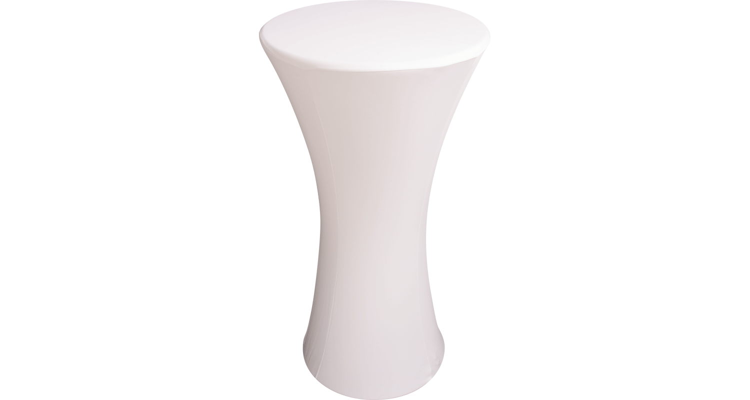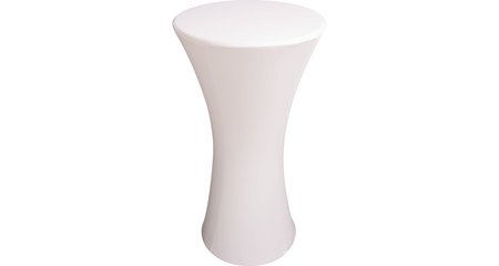 Funda LYCRA-TAB-0.6M-WH en lycra blanca, ajustable a mesas de Ø 60 cm × H 120 cm, lavable a máquina, antideslizante, compatible con iluminación LED inferior.