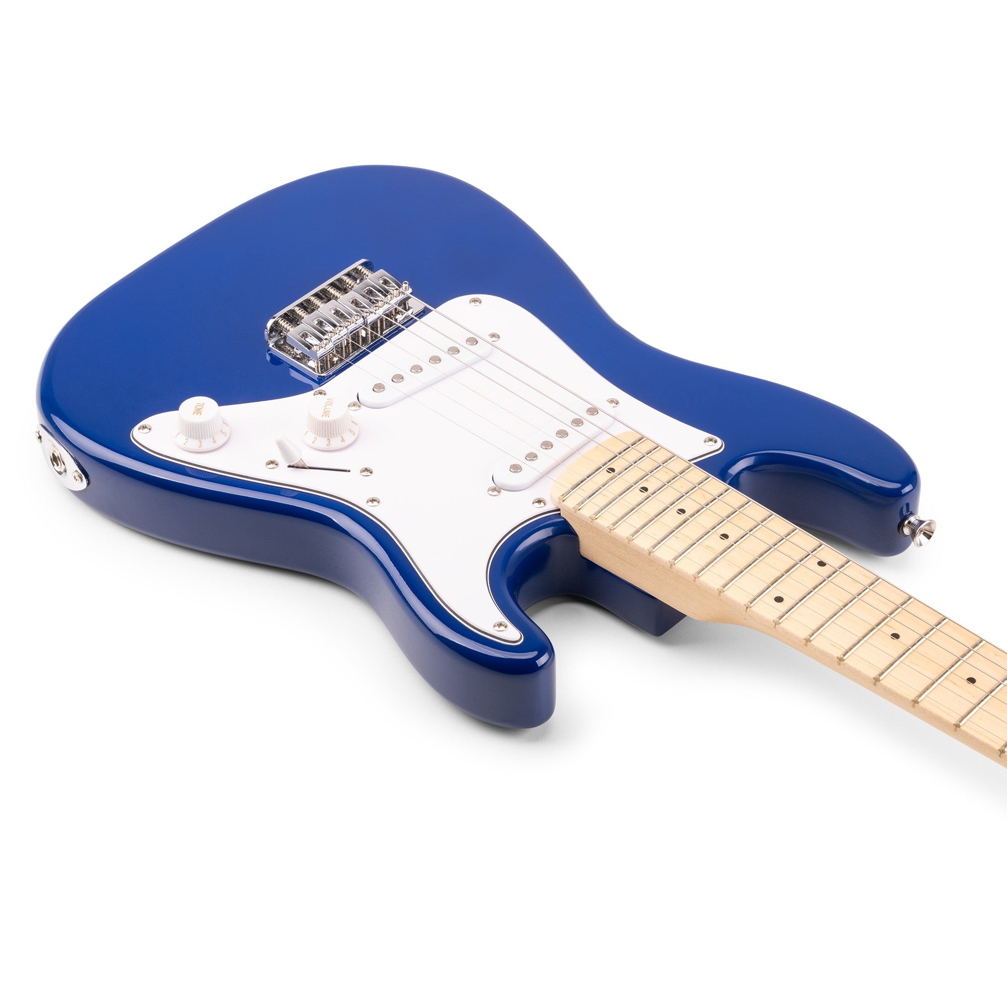 Conjunto de guitarra eléctrica tamaño 1/4 modelo Junior con cuerpo de diseño clásico tipo ST y acabado en color azul. El instrumento cuenta con una longitud total de 810 mm, diapasón con 21 trastes, controles rotatorios de volumen y tono, selector de pastilla de 3 posiciones y sistema de trémolo. El paquete incluye un amplificador de guitarra dedicado con una potencia de salida de 10 Watios y dimensiones de 125 x 80 x 125 mm. El kit se suministra con accesorios esenciales: funda de transporte de nylon con correas, afinador digital cromático de pinza (clip-on), cable de conexión jack-jack de 3 metros, correa ajustable para el hombro, dos púas, juego de cuerdas de repuesto y herramientas de ajuste (llaves Allen).