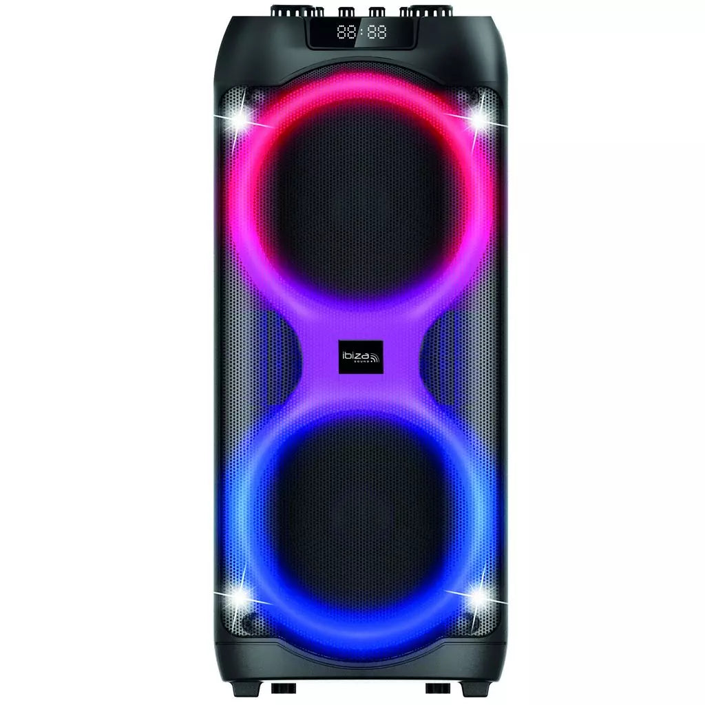 Altavoz activo de 1000 W con 2 woofers de 10″, conectividad Bluetooth, USB y microSD, entrada AUX, dos tomas de micrófono y una de guitarra, controles de volumen, graves, agudos y reverb, función Talkover, grabación integrada, modo TWS y efectos LED dinámicos.