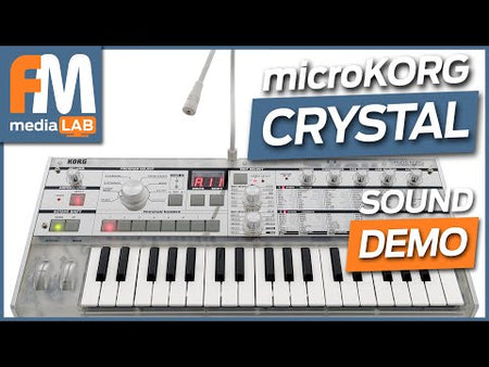 Sintetizador/vocoder KORG microKORG Crystal (edición 20º aniversario). Motor Analog Modeling, 4 voces, 2 partes (Split/Dual); 2 osciladores + ruido; filtro multimodo (LPF −24 dB; LPF/BPF/HPF −12 dB); EG ×2, LFO ×2, Virtual Patch ×4. Vocoder 8 bandas con Formant Shift. 128 programas. Efectos: 3 modulación + 3 delay + EQ 2 bandas (sincronía de delay con arpegiador/MIDI). Arpegiador 6 tipos. Entradas: AUDIO IN 1/2 con selector LINE/MIC; salidas L/MONO, R y auriculares; MIDI IN/OUT/THRU. Alimentación: DC 9 V o 6 × AA. Dimensiones: 524 × 232 × 70 mm; peso 2,4 kg. Incluye adaptador AC, micrófono y funda transparente.