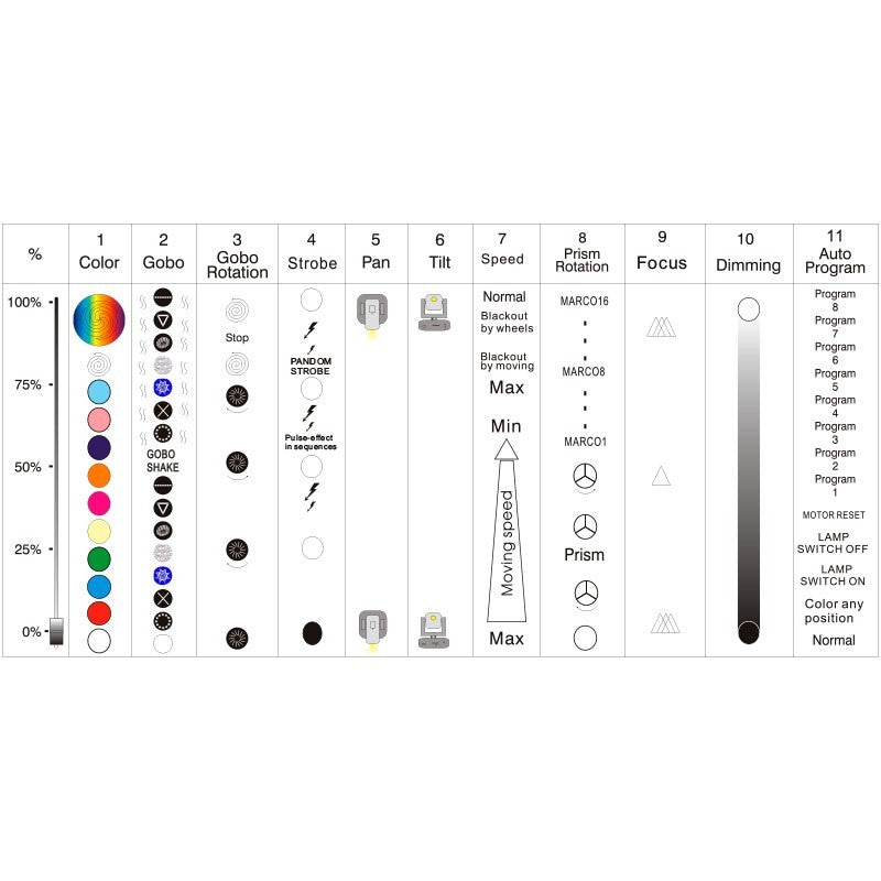 - Programación ágil: 11 canales DMX, autoprogramas y memoria de escenas para configuraciones rápidas en bolo.