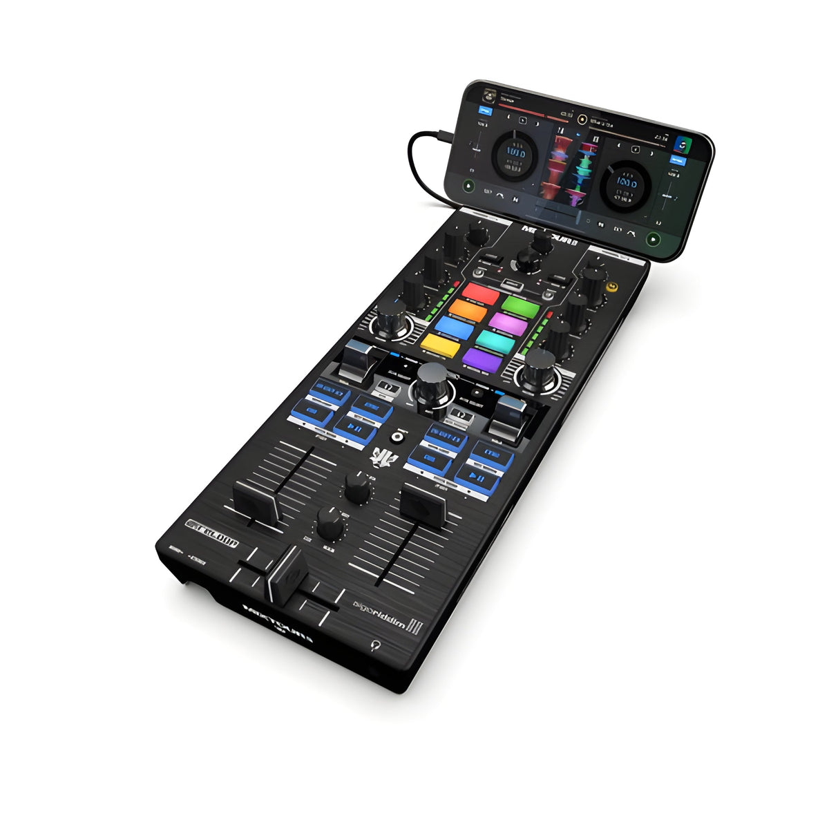 Controladora DJ portátil de 4 decks con interfaz de audio 4×Out/24-bit; DAC Cirrus Logic; salidas: Master RCA bañadas en oro y auriculares 3,5 mm; controles por canal: ganancia, EQ 3 bandas y filtro bipolar LPF/HPF; FX paddles con botones de parámetros y control Dry/Wet; 8 pads RGB (modos Hot Cue, Bounce Loop, Pitch Cue, Instant FX, Auto Loop, Sampler, Saved Loops, Neural Mix™); crossfader de 45 mm; conectividad: USB-C datos + USB-C PD hasta 45 W; dimensiones 129 × 310 × 51 mm; peso 956 g; compatible iOS/iPadOS/macOS/Windows/Android.
