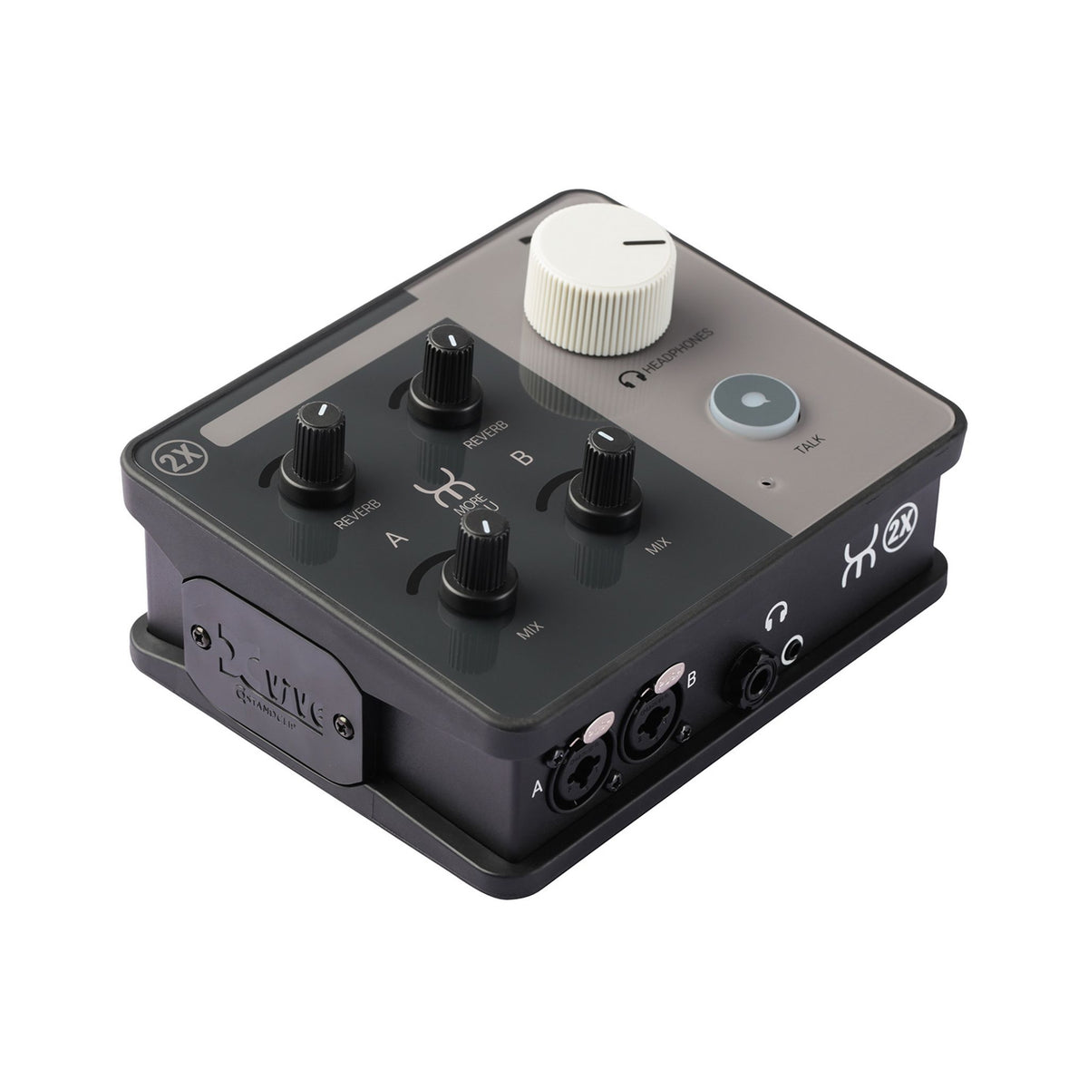 El XVIVE MOREYOU 2X es un módulo de expansión diseñado exclusivamente para integrarse con el HUB MOREYOU, ampliando tus estaciones de monitorización personal y entradas de audio. No funciona de forma independiente: añade dos entradas combo XLR/TRS adicionales con preamplificadores True Gain de 60 dB con pasos de 1 dB, phantom 48 V, filtro pasa-altos y fase en cada canal. Cada usuario puede controlar su nivel de ganancia y reverb de forma independiente en su unidad 2X. Al encadenar hasta ocho módulos (hub principal y/o 2X), el sistema soporta hasta 16 entradas analógicas locales y, con ADAT, un máximo de 24 entradas al DAW. Su conexión USB-C al HUB permite enviar todas las señales simultáneamente a tu DAW, monitores y auriculares. La pantalla LCD y la navegación intuitiva facilitan la gestión de niveles, talkback y auto-ganancia por canal o global.