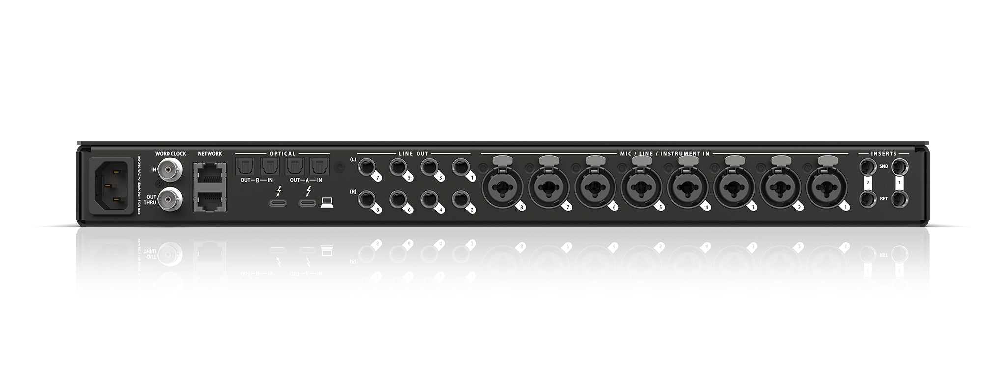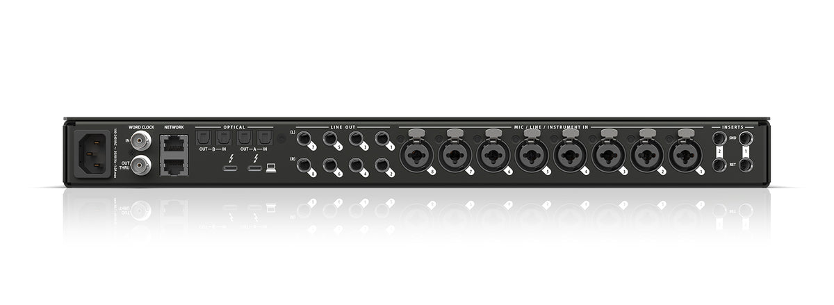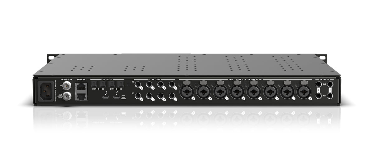 Interfaz de audio profesional en formato rack 1U con conectividad híbrida Thunderbolt 4, USB4 y USB-C de alta velocidad (40 Gbps). La unidad ofrece una configuración de E/S de 26 entradas y 28 salidas físicas, destacando 10 entradas analógicas combo XLR/TRS con preamplificadores de micrófono de 74 dB de ganancia, -129 dBu EIN y alimentación phantom conmutable. Incluye conversión AD/DA con tecnología ESS Sabre32 (125 dB de rango dinámico en salidas), 8 salidas de línea analógicas TRS acopladas en continua (DC-Coupled), 2 salidas de auriculares independientes y 2 bancos de E/S óptica ADAT/TOSLink. Dispone de switch AVB integrado con dos puertos Gigabit Ethernet para expansión de red y transmisión de hasta 128 canales de audio. Cuenta con DSP interno de 32 bits para mezcla de 64 canales y procesamiento de efectos (EQ, dinámica, reverb), gestión mediante software CueMix Pro compatible con control remoto inalámbrico, inserciones analógicas en canales 1-2, E/S Word Clock BNC y funcionalidad de Talkback integrada.
