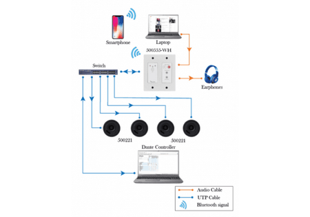 - Integración Dante y AES67: Convierte las señales analógicas y Bluetooth directamente a digital para su distribución a través de la red, compatible con el ecosistema Dante y el transporte de audio RTP AES67.