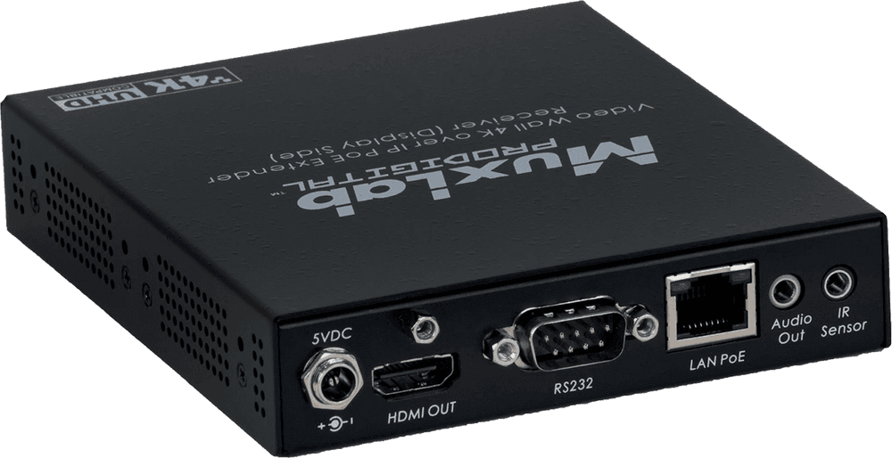 Receptor HDMI sobre IP capaz de recibir señales de vídeo con resolución de hasta 4K@30Hz (4:4:4) y 4K@60Hz (4:2:0) a través de una red Gigabit LAN. La unidad extiende la señal hasta 100 metros sobre cableado Cat5e/6. Utiliza compresión JPEG 2000 con una latencia máxima de 33 ms. Soporta la creación de configuraciones Video Wall y topologías punto a punto, punto a multipunto y multipunto a multipunto. Incluye una salida HDMI, una entrada RJ45, puertos de control bidireccional IR y RS232, y una salida de audio analógico estéreo mini-jack de 3.5mm. Compatible con alimentación a través de Ethernet (PoE IEEE 802.3af). Configurable mediante DIP switch y gestionable a través del controlador de red MuxLab 500812.