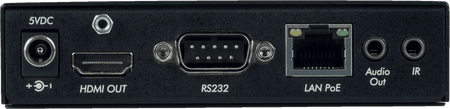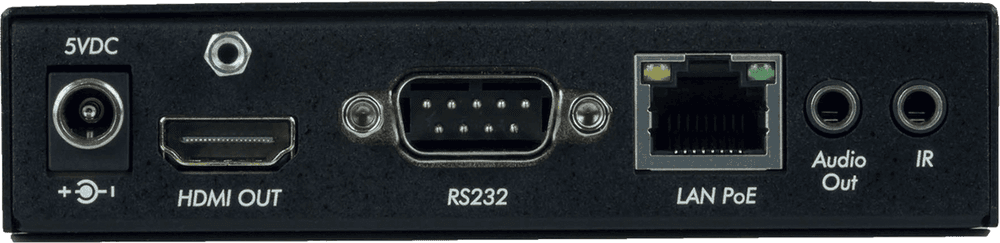 Receptor HDMI sobre IP con soporte para compresión de vídeo H.264/H.265. Recibe y escala señales de vídeo hasta una resolución de 4K a 60Hz (4:4:4). Extiende la señal hasta 100 metros mediante cable Cat5e/6. Dispone de una salida HDMI, una entrada RJ45, salida de audio digital SPDIF (TosLink) y analógica (3.5mm), control por RS232 e IR. Compatible con alimentación a través de Ethernet (PoE PD). Dimensiones: 111 x 92 x 25 mm. Peso: 0,40 kg.