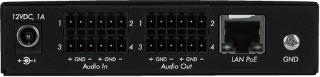 Pasarela de audio bidireccional para redes Dante. Dispone de cuatro canales de entrada y cuatro canales de salida de audio analógico balanceado a través de conectores Phoenix. Compatible con señales de nivel de línea y micrófono. Soporta transmisión de audio de rango completo (20Hz-20KHz) sobre cableado Cat5e/6 hasta 100 metros. Alimentación mediante PoE (PD, IEEE 802.3af). Gestionable a través del software Dante Controller. Dimensiones: 111 x 120 x 25 mm. Peso: 0,70 kg.
