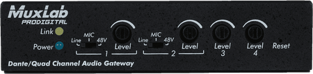 La pasarela de audio MuxLab 500765 es una solución profesional y versátil diseñada para integrar equipos de audio analógico tradicionales con sistemas de audio en red basados en Dante. Este dispositivo funciona como un puente bidireccional, permitiendo que hasta cuatro canales de audio analógico balanceado se transmitan a través de una red IP estándar a equipos compatibles con Dante, y viceversa. Con su capacidad para convertir y transmitir audio de rango completo (20Hz a 20KHz) con una calidad excepcional, el 500765 es ideal para modernizar instalaciones de audio existentes o para ampliar sistemas de sonido profesionales en una amplia variedad de entornos.