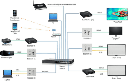 - Gestión Flexible: Puede ser gestionado a través del controlador de red MuxLab Pro Digital Network Controller (500812), la aplicación MuxlabControl para smartphones y tablets, y sistemas de control de terceros.
