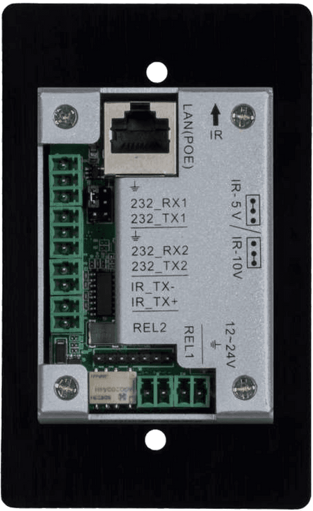 Panel de control mural o de sobremesa con 8 botones programables y retroiluminados. Dispone de un puerto Ethernet (LAN) con soporte PoE (PD), dos puertos RS-232, una salida IR y dos salidas de relé. Permite el control de dispositivos a través de los protocolos TCP/IP, Telnet, HTTP y UDP. Configuración y programación mediante interfaz web integrada con función de aprendizaje IR. Dimensiones de 114 x 70 x 36 mm.