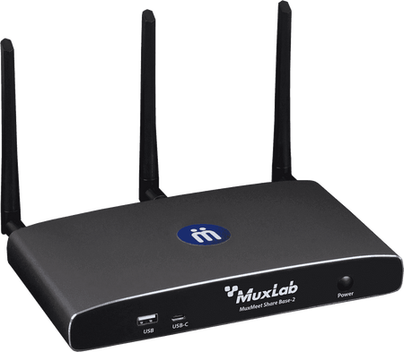 El MuxLab MuxMeet Share Base 2 (modelo 500829) es un avanzado receptor diseñado para transformar cualquier sala de reuniones en un espacio de colaboración híbrido, moderno y eficiente. Este dispositivo elimina las barreras de los cables, permitiendo a los usuarios compartir presentaciones y conectar los periféricos de la sala de forma totalmente inalámbrica. Facilita una experiencia de conferencia fluida y profesional, ideal para el entorno de trabajo actual que combina participantes presenciales y remotos. Con el MuxMeet Share Base 2, cualquier usuario puede conectar su ordenador portátil a la cámara, micrófono, altavoces y pantalla de la sala sin esfuerzo, aprovechando al máximo el sistema audiovisual existente.