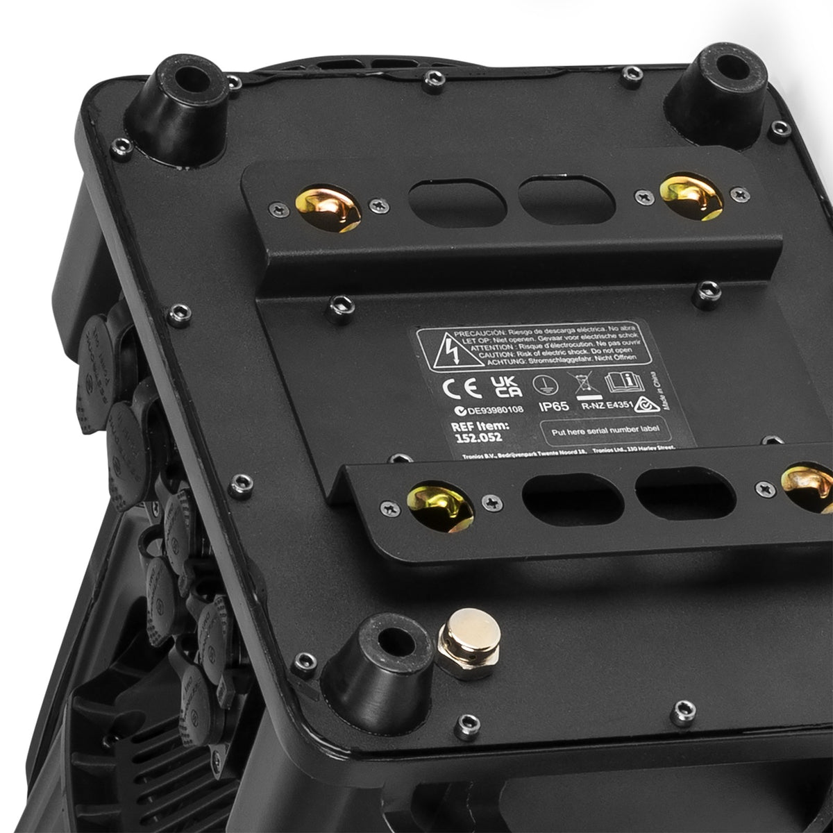 Dispone de entradas y salidas DMX mediante conectores XLR de 3 y 5 pines, lo que facilita la integración en distintos tipos de instalaciones. Para alimentación incorpora Powerconnector TR1 in/out, permitiendo encadenar varias unidades en la misma línea eléctrica dentro de los límites recomendados.