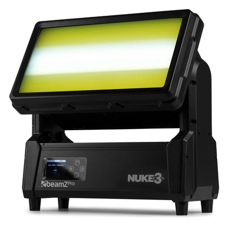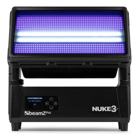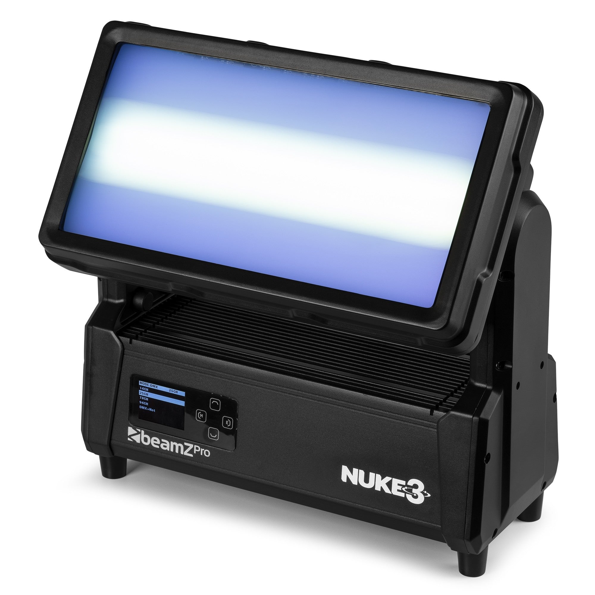 El beamZ Pro Nuke3 es un estroboscópico/foco motorizado híbrido diseñado para aplicaciones profesionales donde se requiere máxima versatilidad, potencia y fiabilidad tanto en interior como en exterior. Con un rango de inclinación motorizado de 180°, este equipo puede trabajar como twin estrobo de alto impacto, como baño de color RGB o como una combinación simultánea de ambos efectos, ofreciendo un abanico de posibilidades creativas para conciertos, festivales, arquitectura, clubs y eventos corporativos.